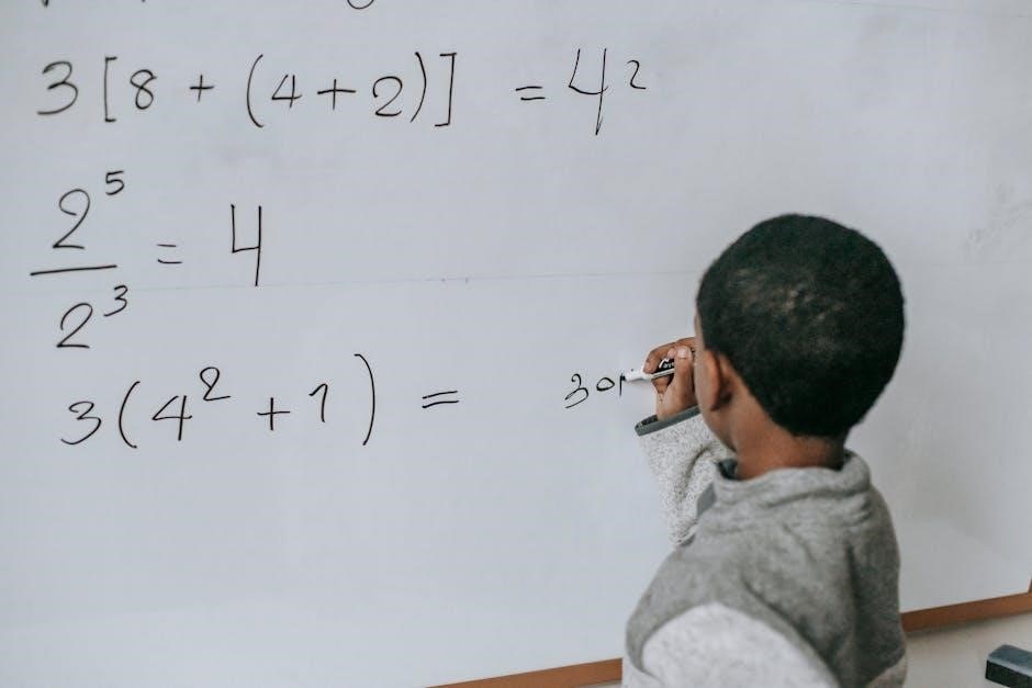 Bring down the next term of the dividend and repeat the process․ PDF exercises often include space to show each step clearly․ Advanced worksheets may present problems with multiple steps and require students to identify where errors occur in a given solution․ Consistent practice with these PDFs builds procedural fluency and a deeper understanding of the algorithm․